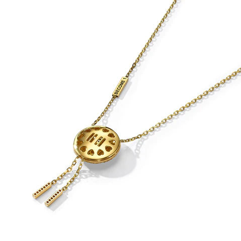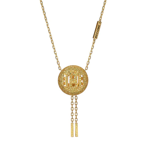 Unveiling the pinnacle of luxury and design, the Golden Lumière Symphony Yellow Sapphires Necklace is a testament to timeless elegance and unparalleled craftsmanship. Set in rich gold, its centerpiece—a resplendent 11:11 shimmering with minute detailing—is complemented by slender, delicate chains that whisper tales of sophistication.