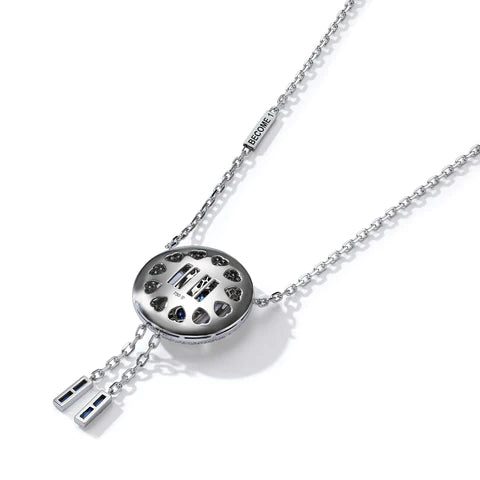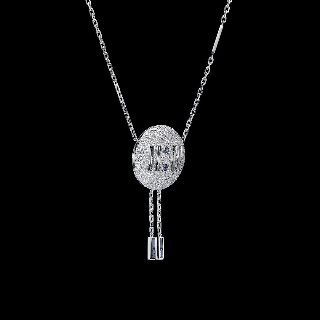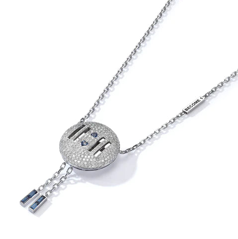 Embark on an odyssey of brilliance and design mastery with the Eclat Radiance Duality Pendant Necklace. Beautifully constructed, this piece elegantly fuses a sparkling, textured disc pendant with modern linear elements, creating a harmonious duality in design. From the lustrous chain stamped with "DECORATIVE" to the 11:11 shimmering appendages cascading downward, every detail speaks of meticulous craftsmanship.